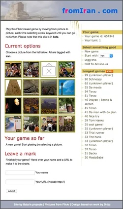 While moving fromIran.com to its own server, I figured it was time to learn more about Flickr’s API. It’s easy, so I realised it was time to leave the concept of the site and create something new. So I created a Flickr-based game, where you create strings of photos connected through their tags.