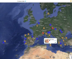 One route that seemed prime material for bringing to Placecloud, is the Historic Cafés Route. Just under 100 cafés, in a dozen, or so, countries. Each place, each café, is in a specific location, that is, it’s not a region, or area, and, surely, as they are all historic, they all must have an interesting story to tell. Right?