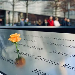 At 11, at the pool for the second tower, I encounter a woman who sticks a flower into the first letter of the recessed name of one of the victims of the terrorist attack. She brushes her hand over the name a few times, as if to wipe away the dirt.
